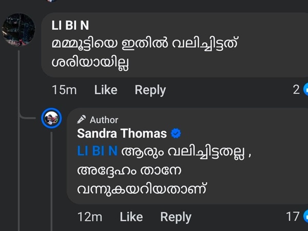 ' എന്നെ മമ്മൂക്ക വിളിച്ചിരുന്നു. മുക്കാല് മണിക്കൂറോളം സംസാരിച്ചു. കേസുമായി മുന്നോട്ടു പോകരുതെന്ന് അദ്ദേഹം ആവശ്യപ്പെട്ടു. ഞാന് അദ്ദേഹത്തോട് ചോദിച്ച ഒറ്റ ചോദ്യമേയുള്ളൂ. മമ്മൂക്കയുടെ മകള്ക്കാണ് ഈ സിറ്റുവേഷന് വന്നിരുന്നതെങ്കിലോ? അവരോടും ഇത് പറയുമോ എന്ന് ഞാന് ചോദിച്ചു. ഇനി സാന്ദ്രയുടെ ഇഷ്ടം പോലെ ചെയ്തോളൂ. ഇനി ഒന്നും ഞാന് പറയുന്നില്ല എന്ന് അദ്ദേഹം പറഞ്ഞു,' സാന്ദ്ര വെളിപ്പെടുത്തി.